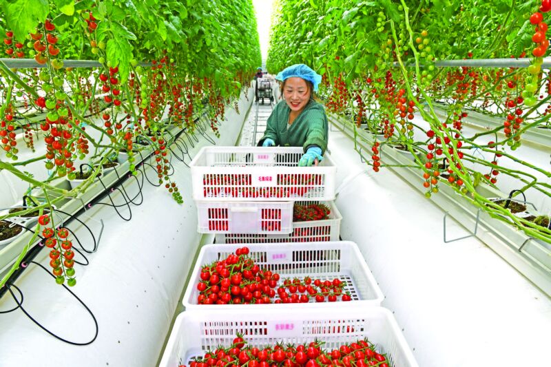 1月15日,淮南市毛集智慧農(nóng)業(yè)科技產(chǎn)業(yè)園,工人采摘的番茄,通過(guò)電商平臺(tái)銷(xiāo)往全國(guó)各地;茨鲜腥嫱七M(jìn)智慧農(nóng)業(yè)建設(shè)讓傳統(tǒng)農(nóng)業(yè)煥發(fā)生機(jī)與活力。
