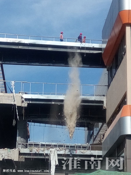 7月17日下午4時(shí)29分,淮河早報(bào)、淮南網(wǎng)記者途經(jīng)淮河大道立交橋時(shí),突然看到位于立交橋東側(cè)一棟在建的樓房上,幾名工人正將建筑垃圾從10多米高的樓上往下拋灑,大量的灰塵隨風(fēng)飄散。 (記者)